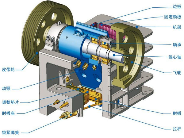 當(dāng)破碎機中落入不能破碎的物料而使機器超過平常負(fù)荷時,肘板傳動裝置可以實現(xiàn)自動折斷,讓PE顎式破碎機停止工作,避免整個機器的損壞,保障生產(chǎn)安全